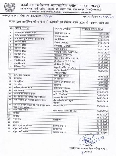 छत्तीसगढ़ व्यावसायिक परीक्षा मंडल ने साल 2026 में आयोजित होने वाली परीक्षाओं का कैलेंडर जारी किया है. व्यापमं द्वारा जारी परीक्षाएं अप्रैल से दिसम्बर तक होगी. इसमें तकनीकी शिक्षा, क्षेत्रीय परिवहन अधिकारी, कृषि, उच्च न्यायालय, गृह पुलिस, नगर सेना, जल संसधान, नगर सेना, संयुक्त भर्ती परीक्षा समेत 31 परीक्षाएं होंगी.