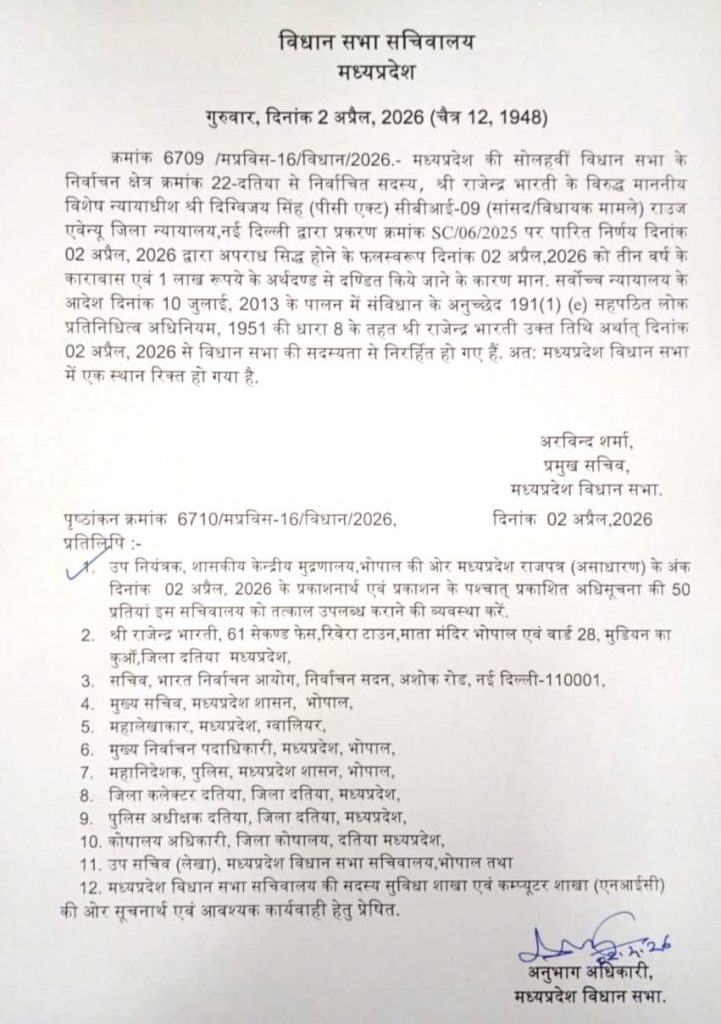 मध्य प्रदेश के दतिया से कांग्रेस विधायक राजेंद्र भारती की सदस्यता समाप्त, विधानसभा ने आदेश जारी किया