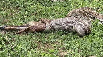 खेत में दिखा 15 फीट लंबा अजगर, कुत्ता निगलने की घटना से गांव में मचा हड़कंप